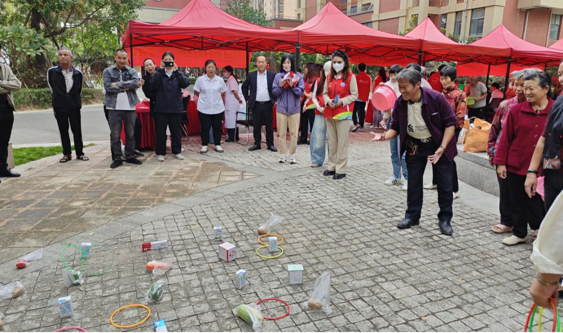 趣味互动乐不停,知识好礼双丰收 为让活动更添乐趣,现场设置了丰富的游戏互动环节。围绕防诈知识、健康膳食、传统文化等内容开展问答活动,长者们积极举手抢答,答对者接过礼品时满脸笑容;果蔬套圈、好运掷骰子、记忆配对小游戏前的摊位更是吸引了众多长者参与,周围不时传出欢呼声。“玩游戏有礼物还能学知识,这活动太开心了”。