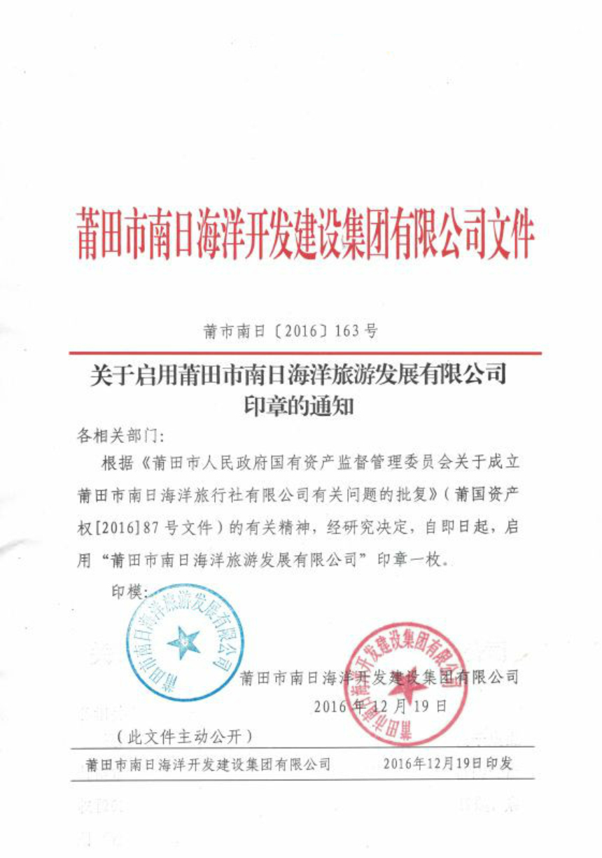 关于启用莆田市南日海洋旅游发展有限公司印章的通知