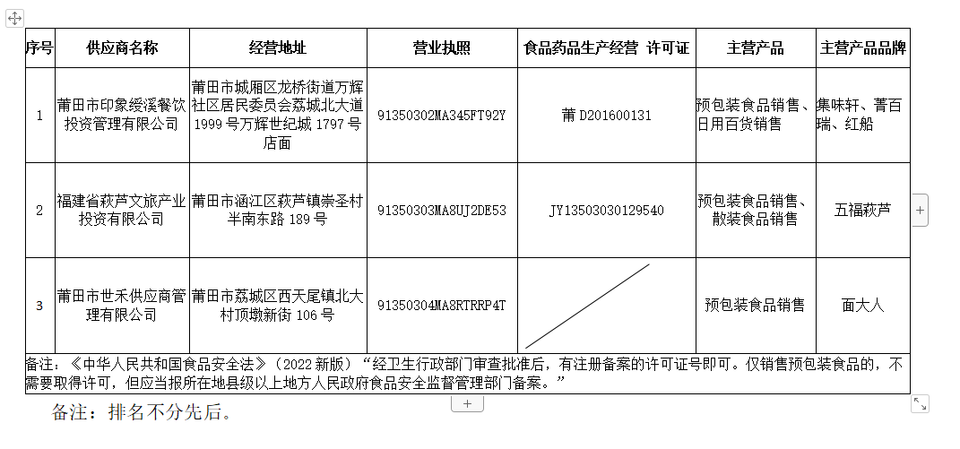 莆田市振兴乡村科技服务有限公司按照《莆田市振兴乡村科技服务有限公司供应商管理办法》通过调研、考察、审核等流程,经过筛选确定新一批优质供应商,详见下表,适用于工会福利采购、“壶兰乡村”乡村振兴服务平台、邻里服务中心及其他渠道。现对这3家入驻供应商进行公示。在实际销售过程中,遇到不在上述公示范围内的供应商时,供应商可适当根据实际情况进行增补。 公示时间为:2023年4月28日上午8点至2023年5月6日下午17点半。 公示期间,欢迎群众来电、来信、来访反映情况,逾期不予受理。 联系部门及电话:市场管理部中心0594-5209923 监督电话0594-6069889 来信来访地址:福建省莆田市荔城区拱辰街道延寿中街1786号荔园小区E区1号楼101.201室(邮政编码:351100) 来访来电时间:正常工作时间(早上:8:00-12:00 下午:14:30-17:30)