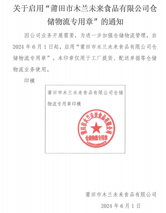 关于启用“莆田市木兰未来食品有限公司仓储物流专用章”的通知
